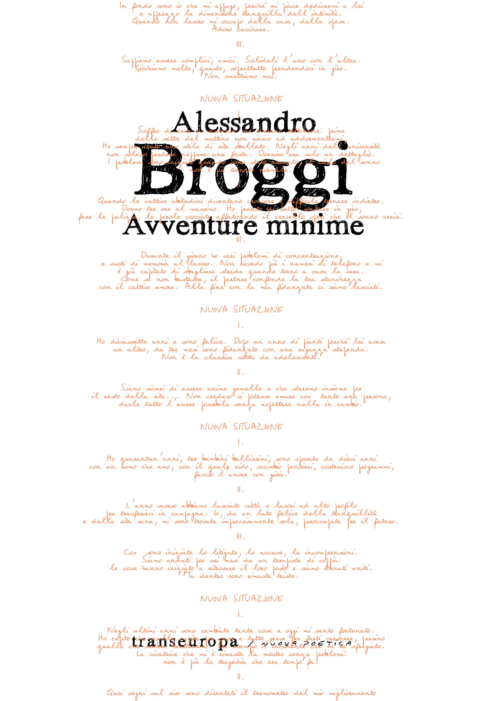 presentazione poeta: «Avventure minime» sistematizza quattordici anni di scrittura di Alessandro Broggi. Nel libro si alternano verso e prosa, micronarrazioni e didascalie cinematografiche. Broggi si serve della lingua televisiva e giornalistica, di quella dei social network e dei reality show. Il suo scopo è rendere evidente l'inautenticità della narrazione quotidiane alle quali ricorriamo, e indurre a riflettere sui rapporti umani che ne derivano